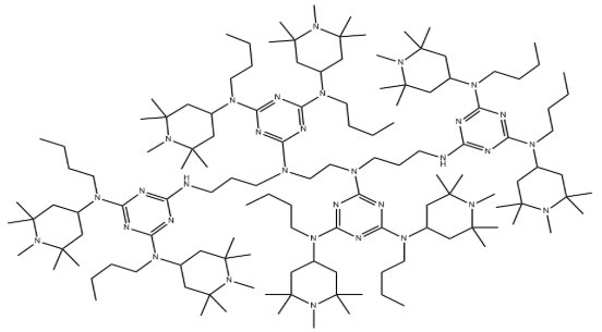 ● Chemical Name:N,N’,N”,N”’-tetrakis(4,6-bis(butyl-(N-methyl-2,2,6,6-tetramethylpiperidin-4-yl)amino)triazin-2-yl)-4,7-diazadecane-1,10-diamine